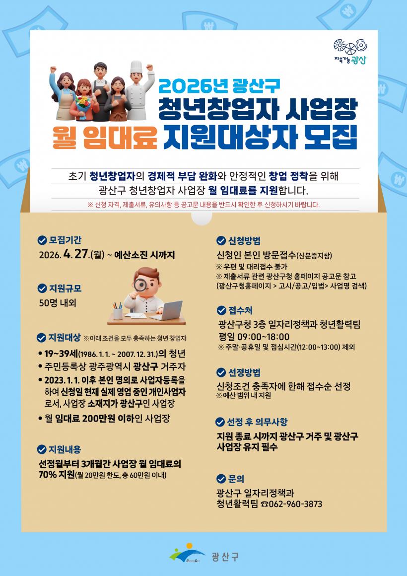 [°ø°£´º½º = ±è´ë¿µ±âÀÚ] ±¤ÁÖ ±¤»ê±¸°¡ â¾÷ÇÑ Ã»³âÀÇ °æÁ¦Àû ºÎ´ãÀ» ´ú°í, ¾ÈÁ¤Àû Á¤ÂøÀ» µ½´Â ¡®2026³â ±¤»ê±¸ û³â â¾÷ÀÚ »ç¾÷Àå ¿ù ÀÓ´ë·á Áö¿ø»ç¾÷¡¯À» ÃßÁøÇÑ´Ù.