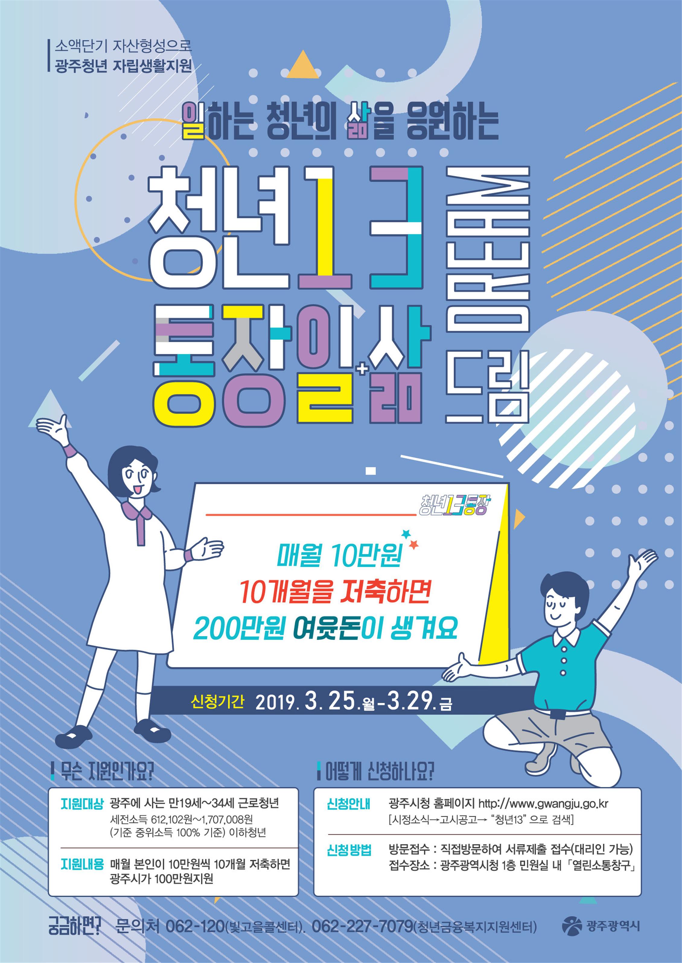 ¡®Ã»³â13(ÀÏ+»î)ÅëÀ塯Àº û³âÀÌ 10°³¿ùµ¿¾È ¸Å¿ù 10¸¸¿øÀ» ÀúÃàÇÏ¸é ±¤Áֽð¡ 100¸¸¿øÀ» ´õÇØ ÃÑ 200¸¸¿øÀÌ ÀúÃàµÇµµ·Ï Áö¿øÇÏ´Â »ç¾÷ÀÌ´Ù. À̹ø »ç¾÷Àº Áö³ÇØ 7¿ù ¡®Ã»³âºñ»ó±ÝÅëÀ塯À̶ó´Â À̸§À¸·Î ½Ã¹ü ¿î¿µµÅ 200¸í ¸ðÁý¿¡ 2589¸íÀÌ ½ÅûÇÏ´Â µî Å« È£ÀÀÀ» ¾ò¾ú´Ù. ÀÌ¿¡ ±¤Áֽô Áö³ÇØ ÇϹݱ⠡®Ã»³â13(ÀÏ+»î)ÅëÀåÀ¸·Î ¸íĪÀ» ¹Ù²Ù°í 2Â÷ Âü¿©ÀÚ¸¦ ¸ðÁýÇÏ´Â µî È®´ë ¿î¿µ¿¡ µé¾î°¬´Ù. À̹ø 3Â÷ ¸ðÁý ´ë»óÀº ±¤ÁÖ¿¡ °ÅÁÖÇÏ´Â ¸¸ 19¼¼ºÎÅÍ 34¼¼±îÁöÀÇ ±Ù·Îû³âÀ¸·Î, ¼¼±ÝÀ» Æ÷ÇÔÇØ ÃÖ±Ù 3°³¿ù °£ Æò±Õ±Þ¿© ±Ù·Î¼ÒµæÀÌ 61¸¸2102¿ø ÀÌ»ó 170¸¸7008¿ø ÀÌÇÏÀÌ¸é ½Åû °¡´ÉÇÏ´Ù.