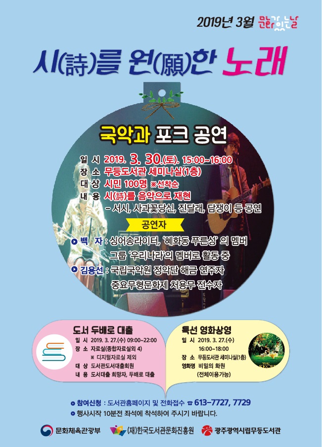 ¹«µîµµ¼°üÀº ¡®3¿ù ¹®È°¡ ÀÖ´Â ³¯¡¯À» ¸Â¾Æ ¿À´Â 30ÀÏ ¿ÀÈÄ 3½Ã ¹«µîµµ¼°ü ¼¼¹Ì³ª½Ç¿¡¼ ¡®½Ã(ãÌ)¸¦ ¿ø(êÃ)³ë·¡, ³ë·¡¸¦ À§ÇÑ ½Ã¡¯ °ø¿¬À» °³ÃÖÇÑ´Ù.