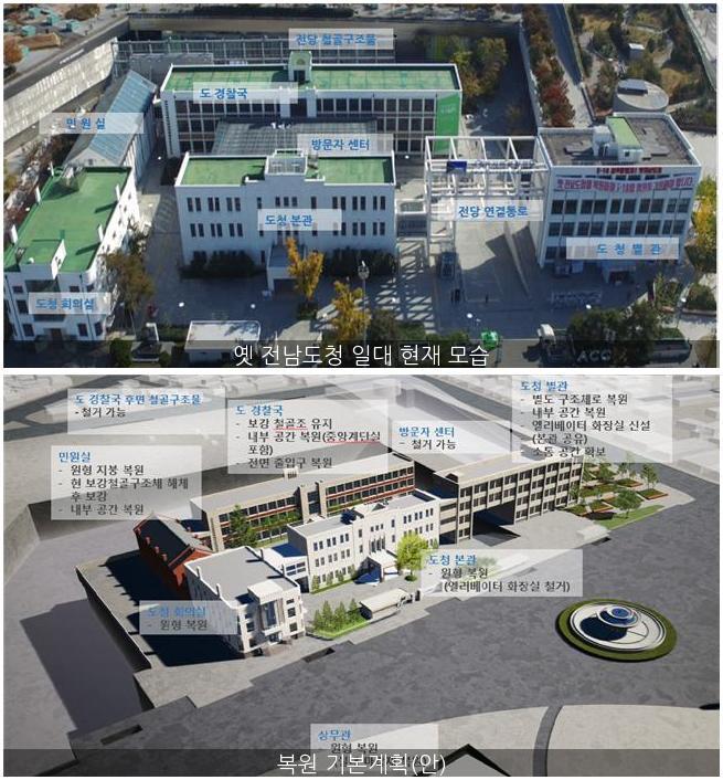 º¹¿ø´ë»óÀº Àü³²µµÃ» º»°ü¡¤º°°ü¡¤È¸ÀǽÇ, µµ °æÂû±¹ ¹× µµ °æÂû±¹ ¹Î¿ø½Ç, »ó¹«°ü µî 6°³ µ¿À¸·Î 5‧18´ç½Ã ÁÖ¿ä Ȱµ¿ °ÅÁ¡À̾ú´ø ½Ã¹Î±º »óȲ½Ç°ú ¹æ¼Û½ÇÀÌ ÀÚ¸®ÇÑ µµÃ» º»°ü 1Ãþ ¼¹«°ú¿Í, ¼ö½À´ëÃ¥À§¿øÈ¸°¡ ÀÖ¾ú´ø 2Ãþ ºÎÁö»ç½Ç¿¡ ¼³Ä¡µÈ ¿¤¸®º£ÀÌÅÍ, ÈÀå½ÇÀ» ö°ÅÇÏ¿© ´ç½ÃÀÇ ¸ð½ÀÀ¸·Î º¹¿øÇÑ´Ù.