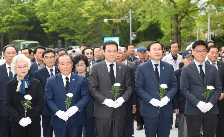 ÇÑÆí À̳¯ ±â³ä½ÄÀº À̿뼷 ½ÃÀå°ú ±èµ¿Âù ±¤ÁÖ½ÃÀÇȸ ÀÇÀå, ÀåÈÖ±¹ ±¤Áֽà ±³À°°¨, ÇÏÀ¯¼º ±¤ÁÖÁö¹æº¸ÈÆÃ»Àå, 4¡¤19Çõ¸í ȸ¿ø ¹× À¯°¡Á·, ±â°ü¡¤´ÜüÀå, ½Ã¹Î, Çлý µî 500¿© ¸íÀÌ Âü¼®ÇÑ °¡¿îµ¥ 4¡¤19Èñ»ýÀÚ ¿µ·É Ã߸ðºñ Âü¹è¸¦ ½ÃÀÛÀ¸·Î ¡ã4¡¤19Çõ¸í µ¿¿µ»ó »ó¿µ ¡ã±¹¹ÎÀÇ·Ê ¡ã4¡¤19Çõ¸í Èñ»ý ¿µ·ÉÀ» À§ÇÑ ¡®¸øÀØÀ» 4¿ùÀÇ ±×³¯¡¯ Ã߸ð½Ã ³¶µ¶ ¡ã4¡¤19Çõ¸í °æ°úº¸°í ¡ã4¡¤19Çõ¸í ¼±¾ð¹® ³¶µ¶ ¡ãÀ¯°øÀÚ Ç¥Ã¢ ¡ã±â³ä»ç ¡ã½Ã¸³ÇÕâ´ÜÀÇ 4¡¤19 ³ë·¡ Á¦Ã¢ ¼øÀ¸·Î ÁøÇàµÆ´Ù.