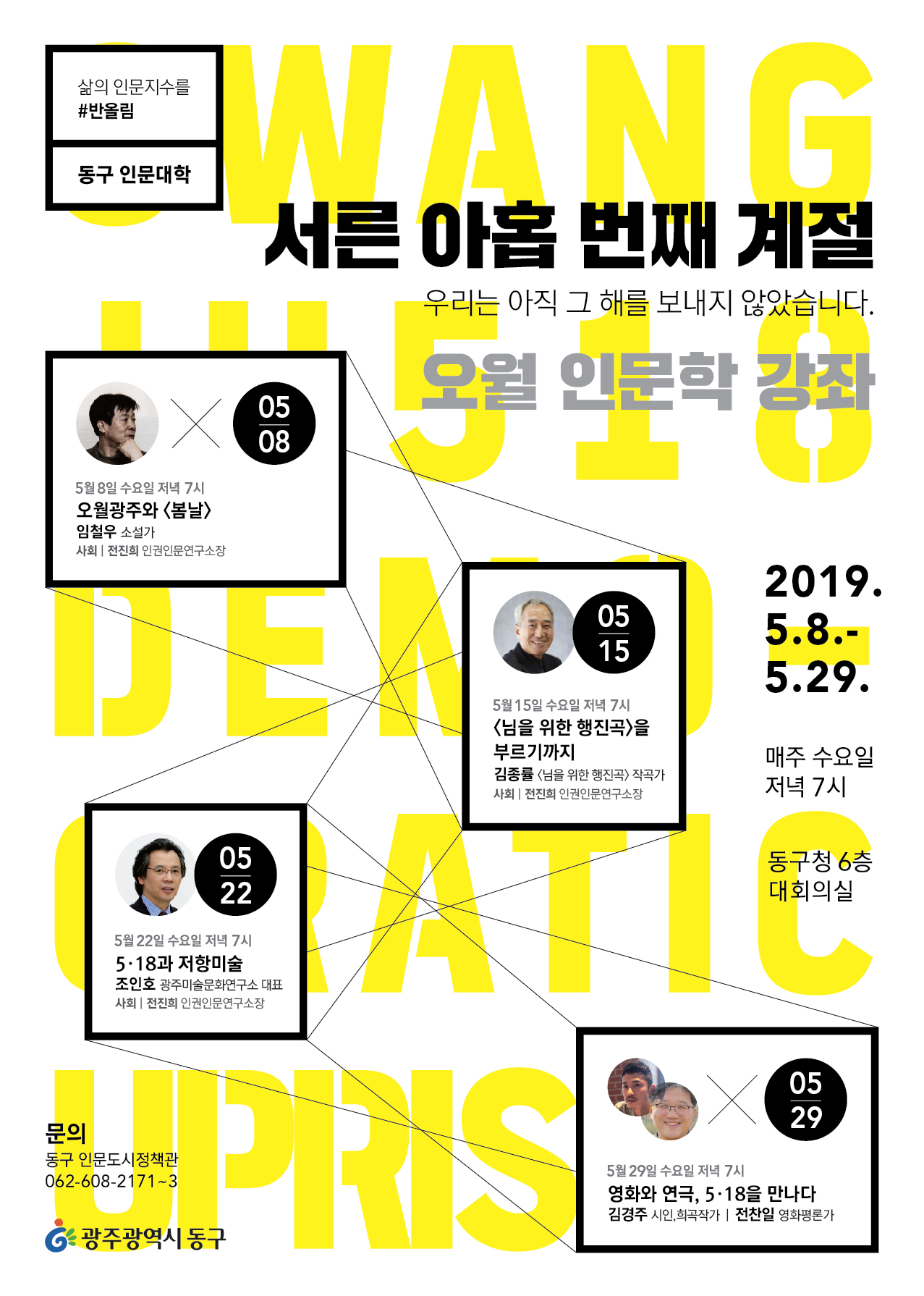 5¿ù ÇÑ ´Þ µ¿¾È ¸ÅÁÖ ¼ö¿äÀÏ ¿ÀÈÄ 7½ÃºÎÅÍ µ¿±¸Ã» 6Ãþ ´ëȸÀǽǿ¡¼ ÁøÇàµÇ´Â À̹ø °Á´ ¹®ÇÐ, ±×¸², ¿µÈ µî ¹®È¿¹¼úÀ» ÅëÇØ 5¡¤18 Àǹ̸¦ µÇ»õ±â°í ±× Á¤½ÅÀ» °è½ÂÇÏ´Â ±âȸ¸¦ ¸¸µé°íÀÚ ±âȹµÆ´Ù.