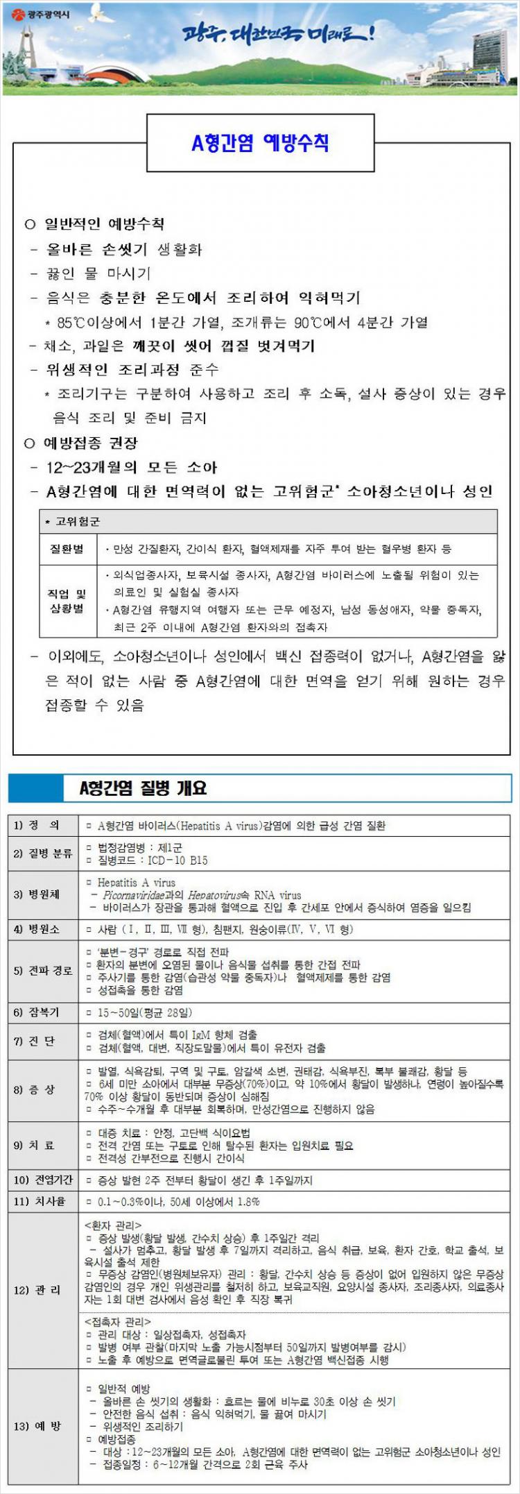 ÀÌ¿¡ µû¶ó ±¤Áֽô AÇü°£¿° ¿¹¹æÀ» À§ÇØ ²úÀÎ ¹° ¸¶½Ã±â, À½½Ä ÀÍÇô¸Ô±â, À§»ýÀûÀÎ Á¶¸®°úÁ¤ Áؼö, ¿Ã¹Ù¸¥ ¼Õ¾Ä±â µî ¿¹¹æ¼öÄ¢ Áؼö¸¦ ´çºÎÇß´Ù.
