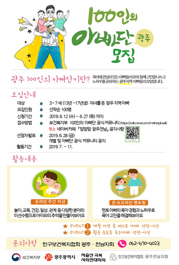 º¸°Çº¹ÁöºÎ 100ÀÎÀÇ ¾Æºü´Ü °ø½Ä Ä¿¹Â´ÏƼ »çÀÌÆ®(https://cafe.naver.com/motherplusall)ÀÇ ¡®±¤ÁÖÁö¿ª°Ô½ÃÆÇ¡¯ ¶Ç´Â ³×À̹öÄ«Æä ¡®¸¾¸¾¸¾ ±¤ÁÖÀü³²¡¯ °øÁö»çÇ×À» ÅëÇØ ½Åû¼¸¦ Á¦ÃâÇÏ¸é µÈ´Ù. ¼±Á¤µÈ Âü¿©ÀÚ´Â 28ÀÏ °³º°°øÁöÇϰí, º¸°Çº¹ÁöºÎ Ä¿¹Â´ÏƼ¿¡ °Ô½ÃÇÒ ¿¹Á¤ÀÌ´Ù.
