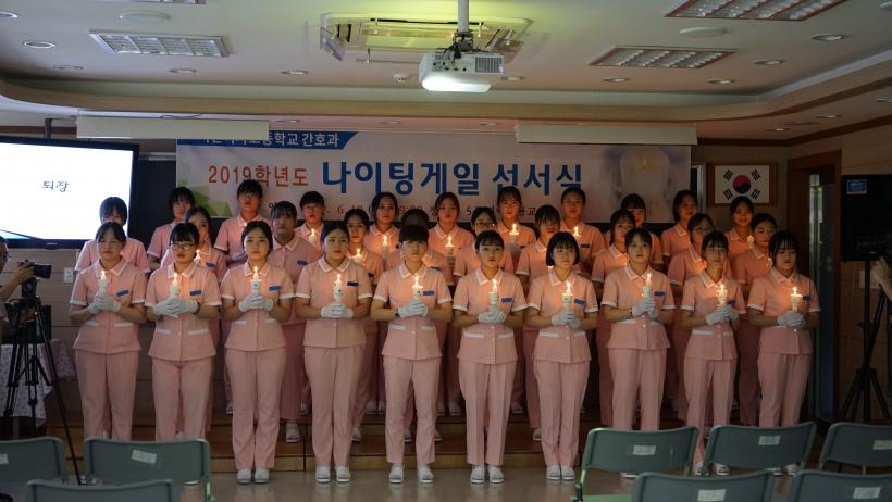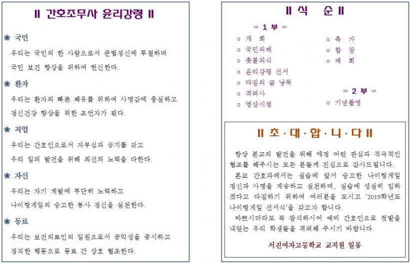 ¼±¼½ÄÀº ³ªÀÌÆÃ°ÔÀÏÀÇ ¼þ°íÇÑ ºÀ»çÁ¤½ÅÀÇ Àǹ̸¦ µÇ»õ±â±â À§ÇØ ÃкÒÀǽÄÀ» ½ÃÀÛÀ¸·Î °£È£ÀÎÀ¸·Î¼ ÁöÄÑ¾ß ÇÒ À±¸®°·É ¼±¼, °Ý·Á»ç, ÀåÈÖ±¹ ±³À°°¨ÀÇ ÃàÇÏ¿µ»ó°ú ÇÔ²² ±³»ç¿Í ÇлýÀÇ Ãà°¡ ¼øÀ¸·Î ÁøÇàÀÌ µÇ¾úÀ¸¸ç, °£È£°ú ÇлýµéÀÌ º´¿ø½Ç½ÀÀ» ÅëÇØ ³ªÀÌÆÃ°ÔÀÏÀÇ Á¤½ÅÀ» ½ÇõÇϸç, °£È£ÀÎÀ¸·Î¼ Àںνɰú ±àÁö¸¦ °®°í »çȸ¿¡ ù¹ßÀ» ³»µó´Â °ÍÀ» °Ý·ÁÇϰí ÃàÇÏÇϱâ À§ÇØ ¸¶·ÃÇÑ ÀÚ¸®¿´´Ù.