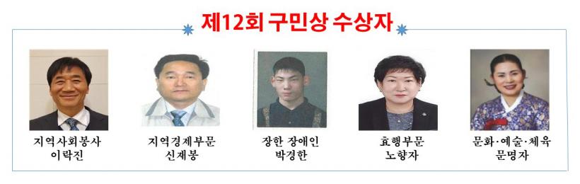 ºÏ±¸´Â ¡°▴Áö¿ª°æÁ¦ ▴Áö¿ª»çȸºÀ»ç ▴¹®È・¿¹¼ú・üÀ° ▴È¿Çà ▴ÀåÇÑ Àå¾ÖÀÎ 5°³ ºÎ¹®¿¡ ½ÅÀçºÀ・À̶ôÁø・¹®¸íÀÚ・³ëÇâÀÚ・¹Ú°æÇÑ ¾¾¸¦ ¡®Á¦12ȸ ±¸¹Î»ó ¼ö»óÀÚ¡¯·Î ¼±Á¤Çß´Ù.¡±°í 26ÀÏ ¹àÇû´Ù.