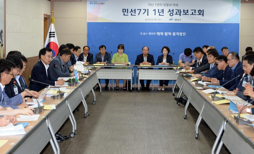 ±è»ïÈ£ ±¤»ê±¸Ã»ÀåÀÌ 26ÀÏ ±¸Ã»¿¡¼ ¿¸° ¡®¹Î¼±7±â 1³â ¼º°úº¸°íȸ¡¯¿¡¼ Áö³ 1³âÀ» µ¹¾Æº¸°í, ¾ÕÀ¸·Î ÆîÃİ¥ ±¸Á¤ û»çÁøÀ» Á¦½ÃÇß´Ù.