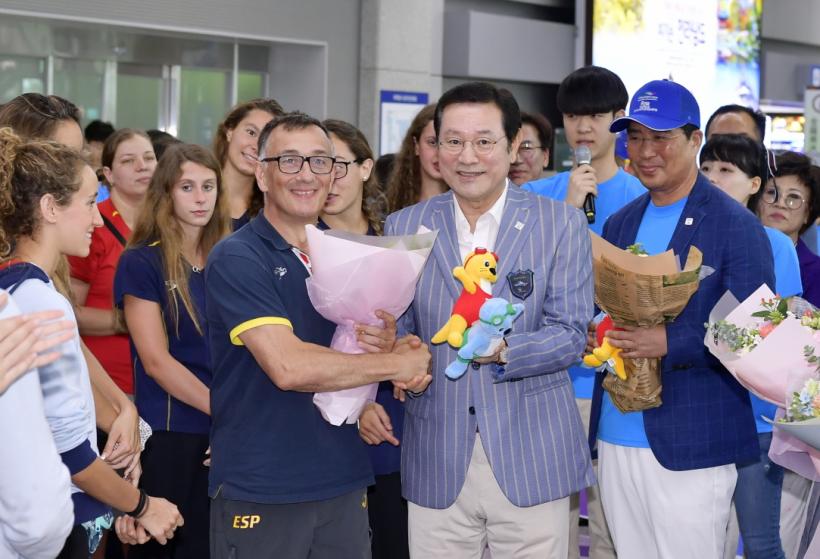 ±¤Áֽô 7ÀÏ ¿ÀÈÄ ¹«¾È°øÇ׿¡¼ À̿뼷 ½ÃÀå°ú ±¤ÁÖ±¹Á¦¿ìȣģ¼±Çùȸ, ½Ã¹Î ¼Æ÷ÅÍÁî µî 200¿©¸íÀÌ °øÇ׿¡ µµÂøÇÑ ½ºÆäÀÎ ¼±¼ö´Ü 23¸í¿¡°Ô ¡®ºñ¿£º£´Ïµµ½º ¾Æ ±¤ÁÖ(Bienvenidos a Gwangju, ±¤ÁÖ¿¡ ¿À½Å °ÍÀ» ȯ¿µÇÕ´Ï´Ù)¡¯ ù ȯ¿µ Çà»ç¸¦ °³ÃÖÇß´Ù.