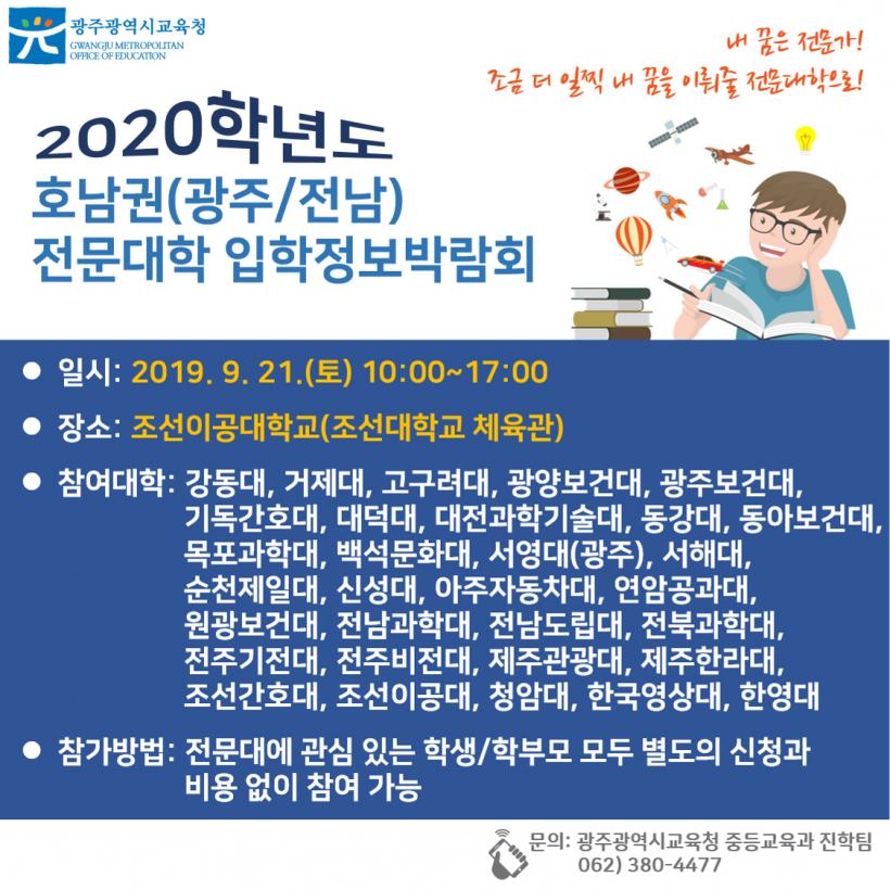 ¡®2020Çг⵵ È£³²±Ç(±¤ÁÖ¡¤Àü³²) Àü¹®´ëÇÐ ÀÔÇÐÁ¤º¸¹Ú¶÷ȸ¡¯°¡ 9¿ù 21ÀÏ(Åä)¿¡ ¿ÀÀü 10½ÃºÎÅÍ ¿ÀÈÄ 5½Ã±îÁö Á¶¼±´ëÇб³ üÀ°°ü¿¡¼ °³ÃֵȴÙ.