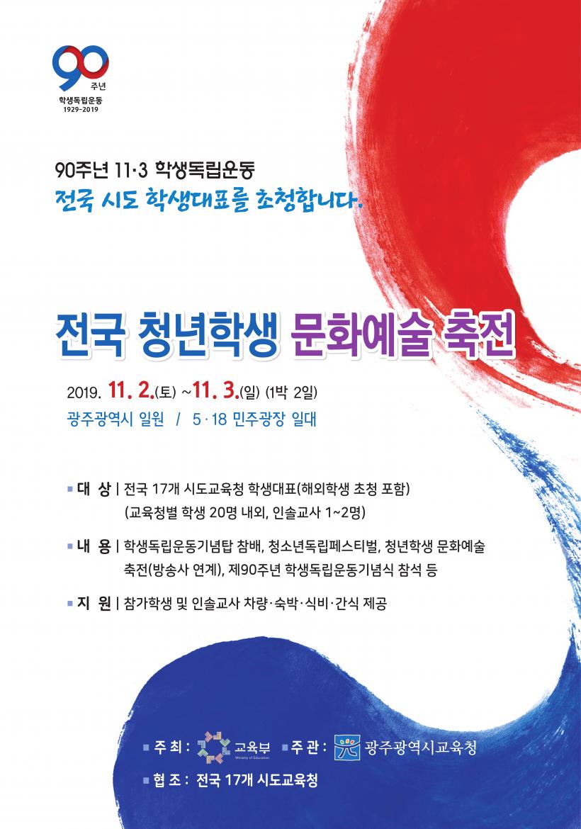 ¿À´Â 11¿ù 2Àϰú 3ÀÏ, 1¹Ú2ÀÏ Çà»ç·Î ÁøÇàµÇ´Â ¡®Àü±¹ û³âÇлý ¹®È¿¹¼ú ÃàÀü¡¯Àº Àü±¹ ½Ãµµ Çлý´ëÇ¥ ¹æ¹®´ÜµéÀÌ Áý°áÇØ ±¤ÁÖÇлýµ¶¸³¿îµ¿±â³äž Âü¹è, û¼Ò³âµ¶¸³Æä½ºÆ¼¹ú, ¹æ¼Û»ç ¿¬°è ¹®È¿¹¼ú °ø¿¬, 90ÁÖ³â Á¤ºÎ±â³ä½Ä Çà»ç Âü¼® µîÀ¸·Î ÁøÇàµÈ´Ù.