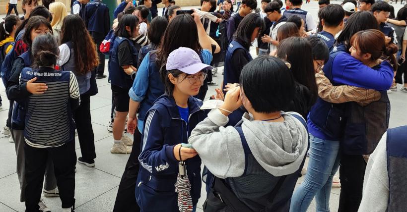 ÇϾóºóÆÀ ÇлýµéÀº ¿ÀÈÄ 3½Ã30ºÐ µåµð¾î ÇϾóºó½Ã Á¶¼±Á· Á¦1ÁßÇб³¿¡ µµÂøÇß´Ù. ¹ö½º 2¹ø°ú ºñÇà±â 1¹øÀ» Ÿ°í ¿Â Çѱ¹ ÇлýµéÀ» Á¶¼±Á·Çб³ ÇлýµéÀÌ ³ª¿Í¼ ¡®Á¶¼±¾î¡¯·Î ¸ÂÀÌÇß´Ù. Çѱ¹½ÄÀ¸·Î º¸¸é ÁßÇб³¿Í °íµîÇб³°¡ °°ÀÌ ÀÖ´Â Á¶¼±Á· Á¦1ÁßÀº ÀÔ±¸ Ç¥¾î¸¦ ¡®Çѱۡ¯·Î Å©°Ô Àû¾î³õ°í ÀÖ¾ú´Ù. ¡®»ç¶û ²Þ ´ëȰ¡ ÀÖ´Â ¿ì¸®Çб³, ÇູÇÑ »îÀÌ ½ÃÀ۵Ǵ °÷.¡¯ ¾ð¾î°¡ ±× ¹ÎÁ·ÀÌ ±×°÷¿¡ »ê´Ù°í ¸»Çϰí ÀÖ¾ú´Ù.