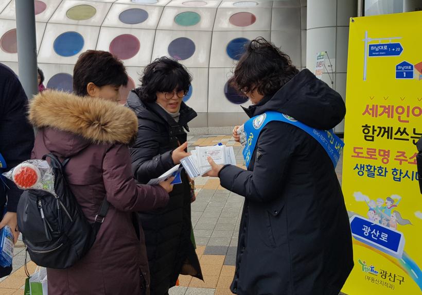 À̳¯ Ä·ÆäÀο¡¼ ±¤»ê±¸ °øÁ÷ÀÚµéÀº ¿ª ¾ÈÆÆÀ» ¿À°¡´Â ½Ã¹Î¿¡°Ô °ü·Ã È«º¸¹°À» ³ª´²ÁÖ¸ç, µµ·Î¸íÁÖ¼Ò »ç¿ëÀ» ´çºÎÇß´Ù.