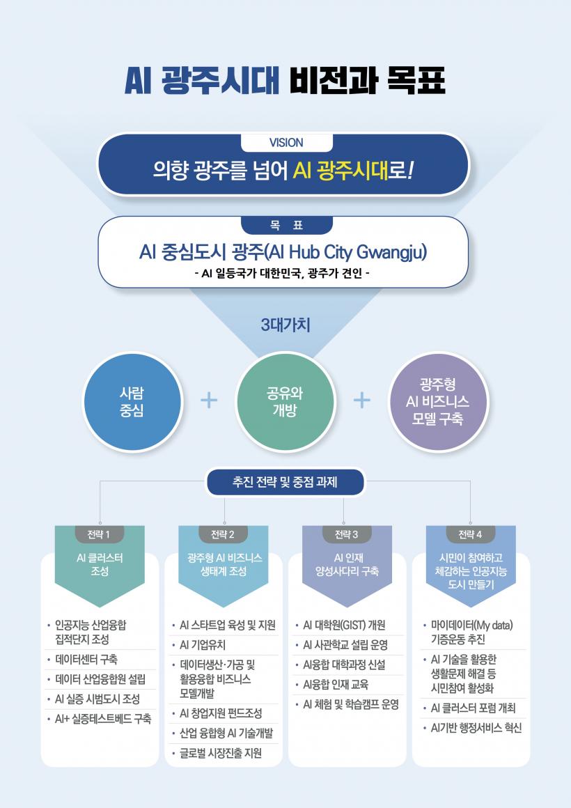 À̿뼷 ±¤ÁÖ½ÃÀåÀº Á÷Á¢ ¹ßÇ¥¸¦ ÅëÇØ ÀΰøÁö´É Ŭ·¯½ºÅÍ »ç¾÷ÀÇ ºñÀüÀ» ¡®ÀÇÇâ ±¤ÁÖ¸¦ ³Ñ¾î AI ±¤Áֽôë·Î!¡¯, ¸ñÇ¥´Â ¡®AI Á߽ɵµ½Ã ±¤ÁÖ(AI Hub City Gwangju), 3´ë °¡Ä¡·Î ¡ã»ç¶÷Á᫐ ¡ã°øÀ¯¿Í °³¹æ ¡ã±¤ÁÖÇü AI ºñÁî´Ï½º¸ðµ¨ ±¸ÃàÀ¸·Î È®Á¤Çß´Ù°í ¹àÇû´Ù.