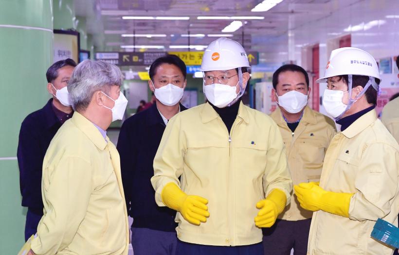 | À̿뼷 ±¤ÁÖ±¤¿ª½ÃÀåÀÌ 5ÀÏ ¿ÀÈÄ µ¿±¸ µµ½Ãöµµ ³²±¤ÁÖ¿ªÀ» ¹æ¹®ÇØ µµ½Ãöµµ°ø»ç °ü°èÀÚµé°ú ´ëÇսǿ¡¼ ½ÅÁ¾ Äڷγª¹ÙÀÌ·¯½º °¨¿°Áõ È®»ê¹æÁö¸¦ À§ÇÑ ¹æ¿ª¼Òµ¶ ÀÛ¾÷ µî ÇöÀåÁ¡°ËÀ» ½Ç½ÃÇϰí ÀÖ´Ù. |