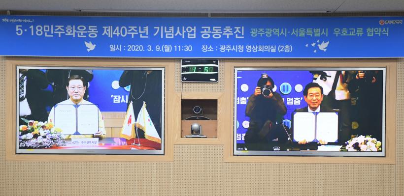 À̿뼷 ±¤ÁÖ½ÃÀå°ú ¹Ú¿ø¼ø ¼¿ï½ÃÀåÀº 9ÀÏ ¿ÀÀü ±¤ÁÖ½Ãû ¿µ»óȸÀǽǰú ¼¿ï½Ãû ¿µ»óȸÀǽǿ¡¼ È»óÀ» ÅëÇØ ¡®5¡¤18¹ÎÁÖȿ Á¦40Áֳ⠱â³ä»ç¾÷ ±¤ÁÖ±¤¿ª½Ã-¼¿ïƯº°½Ã °øµ¿ÁÖÃÖ ¾÷¹«Çù¾à¡¯À» ü°áÇß´Ù.