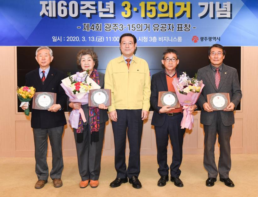 ±¤Áֽô 3¡¤15ÀǰŠ60ÁÖ³âÀ» ¸Â¾Æ ´ç½Ã ¹ÎÁÖȿ¿¡ Çå½Å¡¤±â¿©ÇÑ ±è°æÃµ, ÀÌ»ó¿Á, ±è°æÀº, ¾ç½Â±¸ ¾¾ µî 4¸í¿¡ ´ëÇØ À¯°øÀÚ Ç¥Ã¢À» ¼ö¿©Çß´Ù.