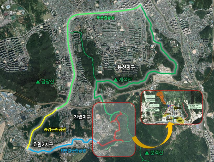 ºÐÀû»ê ´õ Ǫ¸¥ ´©¸®±æ ÄÚ½º°¡ ¿Ï¼ºµÇ¸é Áø¿ùÅÃÁöÁö±¸¿¡¼ Ãâ¹ßÇØ ºÐÀû»êÀ» °ÅÃÄ Á¦¼®»ê µî»ê·Î ¹× ºÀ¼±Áö±¸, ¿ë»êÁö±¸, ¹æ¸²µ¿, ³²±¸ °ü³» Ǫ¸¥±æ°ø¿ø ±¸°£À» ¿À°¥ ¼ö ÀÖ´Â Àå°Å¸® µµ½É ½£±æÀÌ ¿Ï¼ºµÅ °ü³» ÁֹεéÀÇ Èú¸µ Àå¼Ò·Î °¢±¤À» ¹ÞÀ» °ÍÀ¸·Î ±â´ëµÈ´Ù.