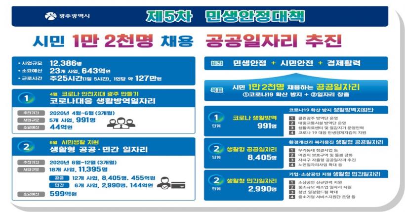 ±¤Áֽô ½Ã¹Î °ø°øÀÏÀÚ¸®»ç¾÷À» 1, 2´Ü°è·Î ³ª´©¾î ÃÑ 23°³ »ç¾÷ 643¾ï¿ø ±Ô¸ð·Î ÃßÁøÇÑ´Ù. 1´Ü°è ¡®»ýȰ¹æ¿ª ÀÏÀÚ¸®»ç¾÷¡¯Àº Äڷγª19 È®»êÀ» Â÷´ÜÇϱâ À§ÇÑ »ýȰ¹æ¿ª°ú Äڷγª19 À§±â ±Øº¹ »ý°èºñ Áö¿ø¾÷¹« µîÀ» ´ã´çÇÏ´Â °ø°ø ÀÏÀÚ¸®»ç¾÷ÀÌ´Ù.