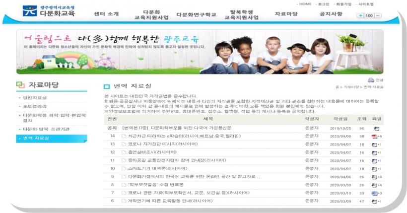 ÇÑÆí Çѱ¹¾î ¹è¿òÅÍ, ´Ù±¹¾î µ¿È±¸¿¬, Çѱ¹¹®È µðµõµ¹ µî ´Ù¹®ÈÇлýÀ» À§ÇÑ ¿Â¶óÀÎ °ø°£ ¹× µµ¿òÀÚ·á, ¹ø¿ª¼ºñ½º µîÀº ±¤Áֽñ³À°Ã» ´Ù¹®È±³À° ȨÆäÀÌÁö(http://family.gen.go.kr)¿¡¼ È®ÀÎÇÒ ¼ö ÀÖ´Ù.