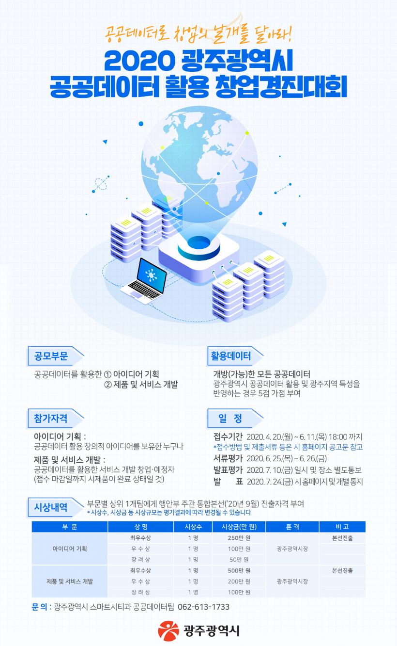 [°ø°£´º½º = ±è´ë¿µ±âÀÚ] ±¤ÁÖ±¤¿ª½Ã´Â °ø°øµ¥ÀÌÅ͸¦ Ȱ¿ëÇÑ Ã¢ÀÇÀû ¾ÆÀ̵ð¾î¿Í ºñÁî´Ï½º ¸ðµ¨À» ¹ß±¼Çϱâ À§ÇØ ¡®2020³â ±¤Áֽà °ø°øµ¥ÀÌÅÍ È°¿ë â¾÷°æÁø´ëȸ¡¯¸¦ °³ÃÖÇÑ´Ù.