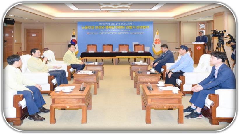 ±¤Áֽô 25ÀÏ ¿ÀÈÄ ½Ãû ºñÁî´Ï½º·ë¿¡¼ (»ç)Àü±¹¾ÆÆÄÆ®ÀÔÁÖÀÚ´ëǥȸÀÇ¿¬ÇÕȸ ±¤ÁÖÁöºÎ, ´ëÇÑÁÖÅðü¸®»çÇùȸ ±¤ÁÖ½Ãȸ, ºû°íÀ»°æºñ¿ø¿¬ÇÕȸ¿Í ¡®°øµ¿ÁÖÅà °ü¸®³ëµ¿ÀÚ ³ëµ¿À뱂 º¸È£¿Í ÇູÇÑ ¾ÆÆÄÆ® ¸¸µé±â À§ÇÑ »ó»ýÇù¾à½Ä¡¯À» °³ÃÖÇß´Ù.