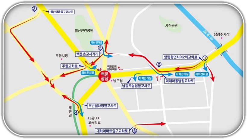 ¿ì¼± ¹é¿î°í°¡Â÷µµ ö°Å°ø»ç¸¦ ½ÃÀÛÇϱâ Àü±îÁö ³²±¸Ã»¿¡¼ ³²±¤ÁÖ ¹æÇâ, ³²±¤ÁÖ¿¡¼ ¹é¿î±¤Àå ¹æÇâ, ¹é¿î±¤Àå¿¡¼ µ¿¾Æº´¿ø ¹æ¸é µµ·Î¿¡ Â÷·Î¸¦ Ãß°¡Çϰí Á¢±Ù·Î¸¦ ÃÖ¼Ò 2°³ Â÷·Î ÀÌ»ó È®º¸ÇØ µµ·Î ¿ë·®À» Áõ´ëÇÑ´Ù.