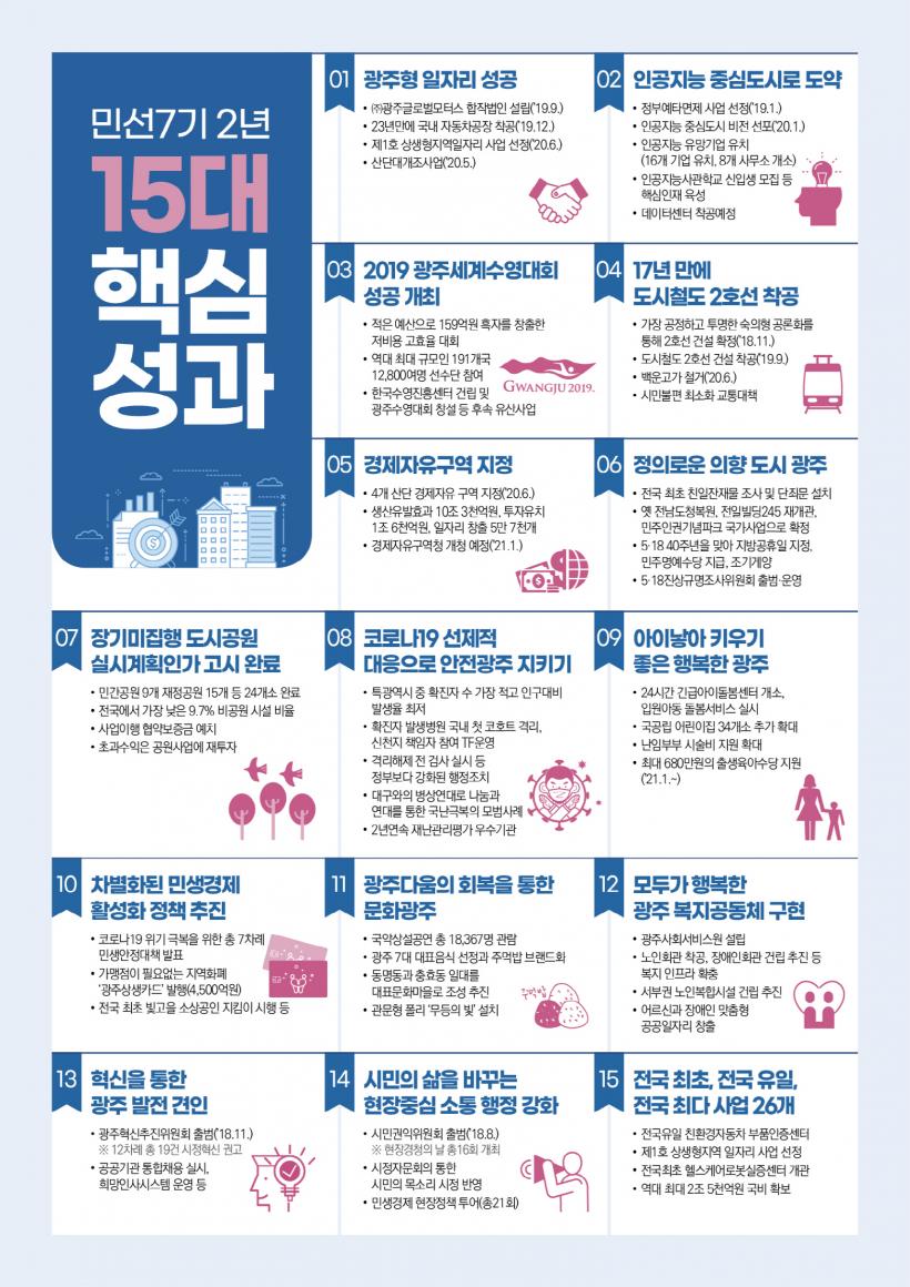 Áö³ 2³â °£Àº Á¤ÀÇ·Ó°í dz¿ä·Î¿î ±¤ÁÖ °Ç¼³À» À§ÇÑ ±âÃÊ¿Í ±â¹ÝÀ» źźÇÏ°Ô ´ÙÁ®¿Ô´Ù. ¾ÕÀ¸·Î 2³âÀº ÀÌ·¯ÇÑ ÀÎÇÁ¶ó ±â¹ÝÀ» ¹ÙÅÁÀ¸·Î ÀÏÀÚ¸® âÃâ, ¼Òµæ Áõ°¡, Áö¿ª°æÁ¦ Ȱ¼ºÈ µî ½Ã¹ÎµéÀÌ Ã¼°¨ÇÒ ¼ö ÀÖ´Â ¼º°ú âÃâ¿¡ ÁÖ·ÂÇÒ °ÍÀÌ´Ù.