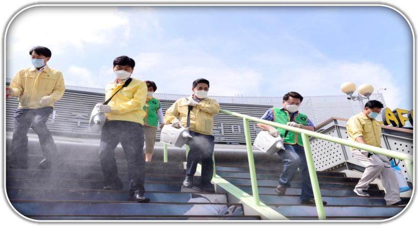 ¼±¸ÀÇ¿øµé°ú ÀÚÀ²¹æÀç´ÜÀº Äڷγª19°¡ È®»êµÇ°í ÀÖ´Â Á¡À» °¨¾È, Å͹̳Π±¤Àå°ú ¹ö½º½Â°Àå, ½Ç³»¿¡¼´Â Å͹̳ΠÃâÀÔ±¸¿Í ¿¡½ºÄ÷¹ÀÌÅÍ ¹× °è´Ü ¼ÕÀâÀÌ µî ÁÖ·Î ¹ÙÀÌ·¯½º°¡ ÀüÆÄµÇ±â ½¬¿î °÷À» Áß½ÉÀ¸·Î ¼Òµ¶¾àÀ» »ìÆ÷Çϰí, ±â°è½Ä ½ºÇÁ·¹À̸¦ ºÐ»çÇÏ´Â ¹æ¿ªÈ°µ¿À» ÆîÃÆ´Ù.