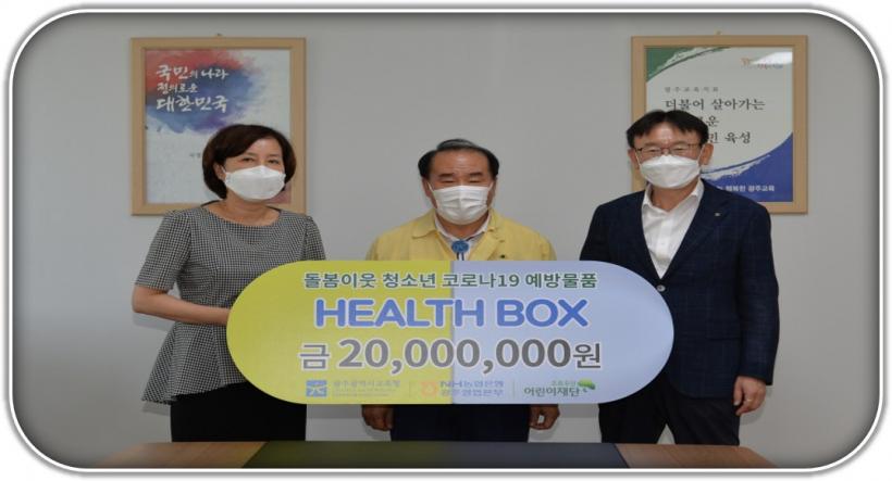 [°ø°£´º½º = ±è¼ö±Ù±âÀÚ] ±¤Áֽñ³À°Ã»(±³À°°¨ ÀåÈÖ±¹)ÀÌ NH³óÇùÀºÇà ±¤ÁÖ¿µ¾÷º»ºÎ(º»ºÎÀå ÃÖ¿µ)·ÎºÎÅÍ 2,000¸¸ ¿ø »ó´çÀÇ ¡®°Ç°²Ù·¯¹Ì(Health Box)¡¯¸¦ Áö³ 8ÀÏ Àü´Þ¹Þ¾Ò´Ù.