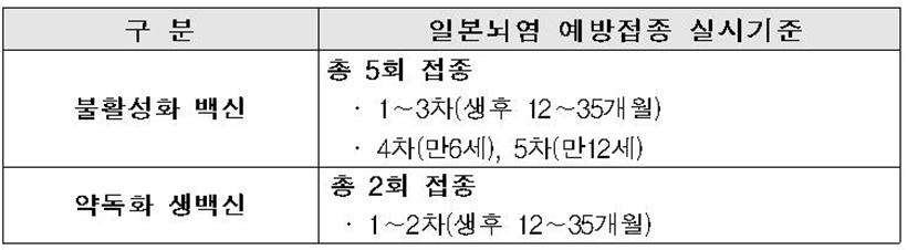±¹°¡¿¹¹æÁ¢Á¾ »ç¾÷ ´ë»óÀÎ »ýÈÄ 12°³¿ù¿¡¼ ¸¸12¼¼ ÀÌÇÏ ¾î¸°À̴ ǥÁØ¿¹¹æÁ¢Á¾ÀÏÁ¤¿¡ ¸ÂÃç Á¢Á¾À» ¸¶ÃÄ¾ß Çϰí, ¸é¿ª·ÂÀÌ ¾ø°í ¸ð±â ³ëÃâ¿¡ µû¸¥ °¨¿° À§ÇèÀÌ ³ôÀº ¼ºÀÎ ´ë»óÀÚ´Â ÀϺ»³ú¿° ¿¹¹æÁ¢Á¾ÀÌ ±ÇÀåµÈ´Ù.(¸¸12¼¼ ÀÌÇÏ ¾î¸°ÀÌ´Â Àü±¹ º¸°Ç¼Ò ¹× ÁöÁ¤ ÀÇ·á±â°ü(¿¹¹æÁ¢Á¾µµ¿ì¹Ì ȨÆäÀÌÁö(https://nip.cdc.go.kr) ¶Ç´Â ½º¸¶Æ®Æù ¾Û¿¡¼ È®ÀÎ)¿¡¼ ÁÖ¼ÒÁö¿¡ °ü°è¾øÀÌ ¹«·áÁ¢Á¾ °¡´É)