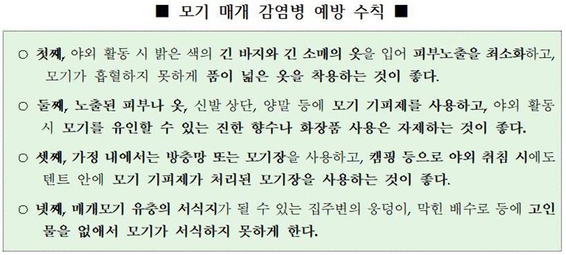 ÀÌ¿¡, ±¤Áֽô ¸ð±â¿¡ ¹°¸®Áö ¾Êµµ·Ï ¾ß¿ÜȰµ¿ ½Ã ±ä ¹ÙÁö¿Í ±ä ¼Ò¸Å ¿ÊÀ¸·Î ÇǺγëÃâÀ» ÃÖ¼ÒÈ Çϰí, ¸ð±â ±âÇÇÁ¦¸¦ »ç¿ëÇÏ´Â µî ¸ð±â ¸Å°³ °¨¿°º´ ¿¹¹æ ¼öÄ¢À» ÁؼöÇØÁÙ °ÍÀ» ´çºÎÇß´Ù.
