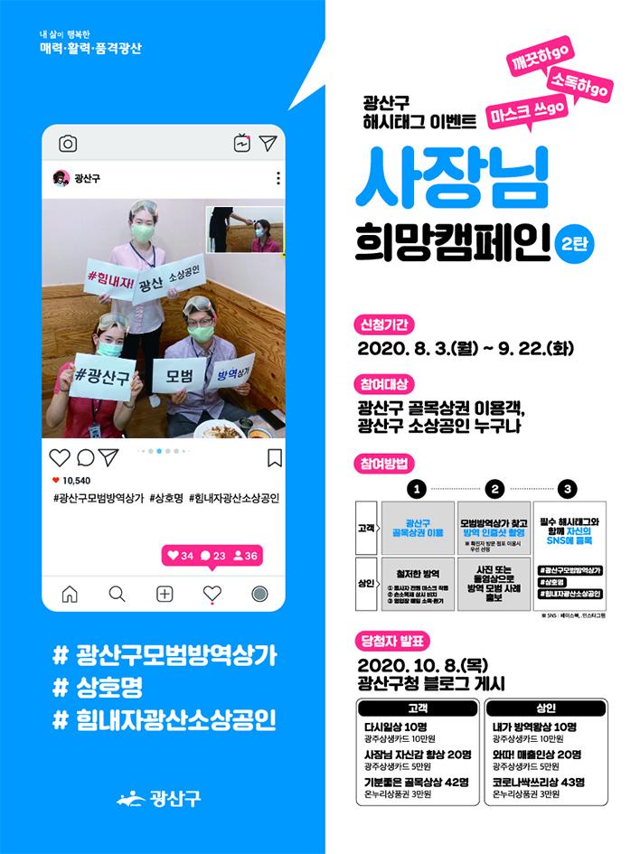 [°ø°£´º½º = ±è¿îö±âÀÚ] ±¤»ê±¸(±¸Ã»Àå ±è»ïÈ£)°¡ Äڷγª19 Áö¿ª»çȸ Àç È®»êÀ¸·Î À§ÃàµÈ °ñ¸ñ»ó±ÇÀÇ È°¼ºÈ¿Í ½Ã¹ÎÀÇ °ñ¸ñ»óÁ¡ ¾È½É ÀÌ¿ëÀ» À§ÇØ ¡®»çÀå´Ô Èñ¸Á Ä·ÆäÀΡ¯ 2źÀ¸·Î ¡®¸ð¹ü ¹æ¿ª »ó°¡ ã±â¡¯¸¦ ¿À´Â 9¿ù 22ÀϱîÁö ½Ç½ÃÇÑ´Ù.