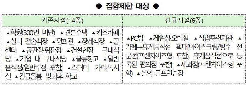 ¹ÐÁýµµ°¡ ³ôÀº ´ÙÁßÀÌ¿ë½Ã¼³ 20°³ ¾÷Á¾¿¡ ´ëÇØ¼´Â ÁýÇÕÁ¦ÇÑ ÇàÁ¤¸í·ÉÀÌ ¿¬À嵯´Ù. °áÈ¥½ÄÀå°ú Àå·Ê½ÄÀå, ¿µÈ°ü µî ±âÁ¸¿¡ ÇàÁ¤¸í·ÉÀ» ³»·È´ø 14°³ ¾÷Á¾¿¡ Á÷¾÷ÈÆ·Ã±â°ü, Á¦°úÁ¡, ½Ç¿Ü °ñÇÁ¿¬½ÀÀå µî 6°³ ¾÷Á¾À» Ÿ ½Ã¼³°úÀÇ ÇüÆò µîÀ» °¨¾ÈÇØ Ãß°¡Çß´Ù.