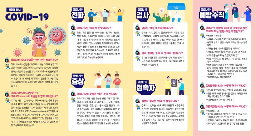 ¸®Ç÷¿¿¡´Â Äڷγª19ÀÇ º´¿øÃ¼ Á¤º¸, ÀüÆÄ ¹æ¹ý°ú ÁÖ¿ä Áõ»ó, °Ë»ç ¹æ¹ý, Á¢ÃËÀÚ ¹üÀ§, ¿¹¹æ¼öÄ¢ µîÀÌ ´ã°ÜÁ® ÀÖ´Ù.