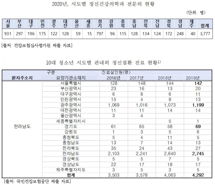 ÀÌ·Î ÀÎÇØ, ±¹¹Î°Ç°º¸Çè°ø´ÜÀÌ Á¦ÃâÇÑ 10´ë û¼Ò³â ½Ãµµº° °ü³»¿Ü Á¤½ÅÁúȯ Áø·á ÇöȲÀ» º¸¸é, Áö¹æ¿¡ °ÅÁÖÇÏ´Â 10´ë´Â ¼öµµ±Ç, ±¤¿ª½Ã °ÅÁÖ 10´ë¿¡ ºñÇØ ŸÁö¿ª¿¡¼ Á¤½ÅÁúȯ Áø·á¸¦ ¹ÞÀº ºñÀ²ÀÌ ´õ ³ô¾Ò´Ù. ¿¹ÄÁ´ë 2019³â Àü³²¿¡¼´Â Á¤½ÅÁúȯ Áø·á¸¦ ¹ÞÀº 4,292¸í °¡¿îµ¥ 1,199¸íÀÌ ±¤ÁÖ±¤¿ª½Ã¿¡¼, 211¸íÀÌ ¼öµµ±Ç¿¡¼ Áø·á¸¦ ¹Þ¾Ò´Ù. ¾à 100¸í Áß 33¸íÀÌ Áý ±Ùó¿¡¼ Áø·á¸¦ ¹ÞÁö ¸øÇÏ°í ¿øÁ¤Áø·á¸¦ °£ °ÍÀÌ´Ù.