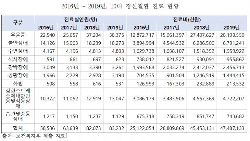 ±¹È¸ ±³À°À§¿øÈ¸ ¼µ¿¿ë ÀÇ¿øÀÌ º¸°Çº¹ÁöºÎ¿¡¼ Á¦Ãâ¹ÞÀº ÀÚ·á¿¡ µû¸£¸é Á¤½ÅÁúȯ Áø·á¸¦ ¹ÞÀº 10´ë°¡ 16³â 5,836¸í¿¡¼ 19³â 8,323¸íÀ¸·Î 42% Áõ°¡ÇÑ °¡¿îµ¥ ¿ì¿ïÁõ 70%, °øÈ²Àå¾Ö 49%, ºÒ¾ÈÀå¾Ö 29% ¼øÀ¸·Î ³ôÀº Áõ°¡À²À» º¸¿´´Ù. ÀÌ¿Í ÇÔ²² Áø·áºñµµ 251¾ï¿¡¼ 474¾ïÀ¸·Î ¾à 89% ´Ã¾î³µ´Ù.