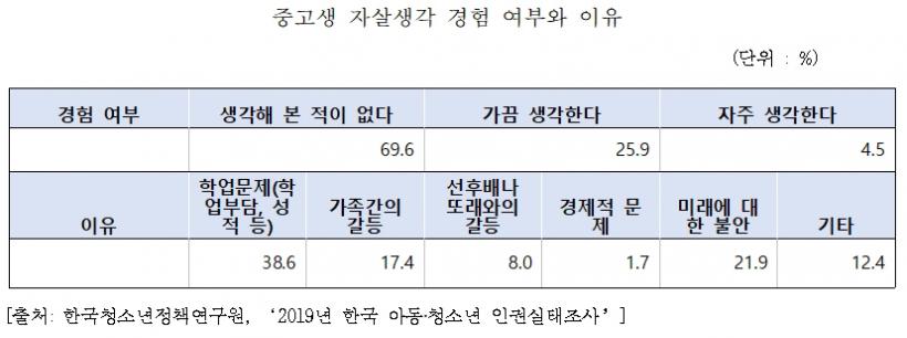 Çѱ¹Ã»¼Ò³âÁ¤Ã¥¿¬±¸¿øÀÌ Á¶»çÇÑ ¡®2019 Çѱ¹ ¾Æµ¿‧û¼Ò³â ÀαǽÇÅÂÁ¶»ç¡¯¿¡ ÀÇÇϸé ÀÚ»ìÀ» »ý°¢Çغ» Áß°íµîÇлýÀº 30.4%¿¡ ´ÞÇÏ°í ±× ÀÌÀ¯´Â Çо÷¹®Á¦ 38.6%, ¹Ì·¡¿¡ ´ëÇÑ ºÒ¾È 21.9%, °¡Á·°£ÀÇ °¥µî 17.4% ¼øÀ̾ú´Ù.