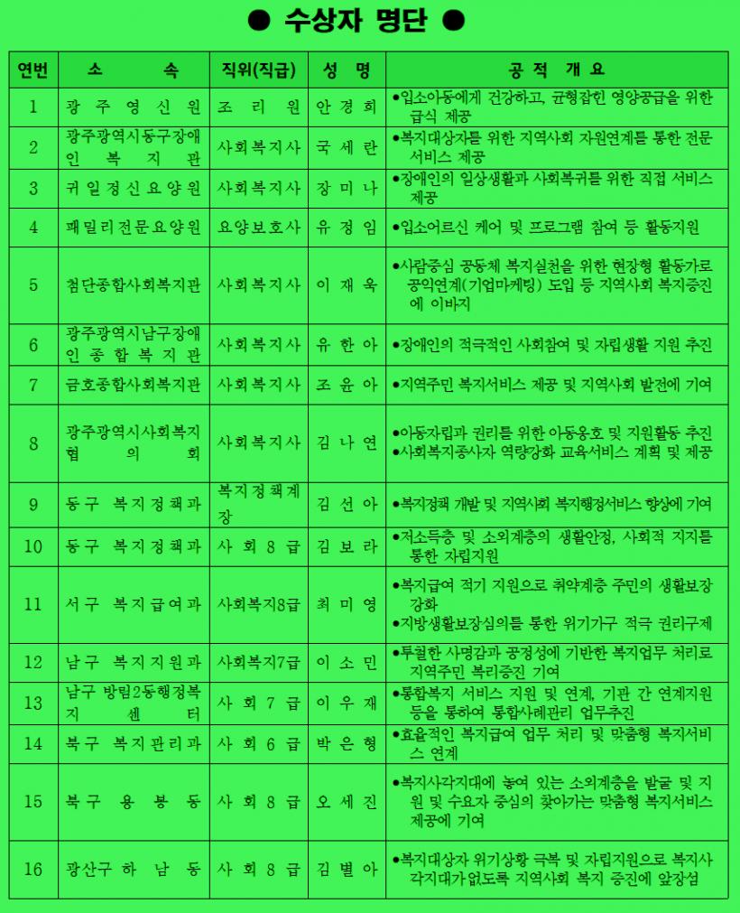 ǥâÆÐ ¼ö»óÀÚ´Â »çȸº¹ÁöÇöÀå µî º¹ÁöÀϼ±¿¡¼ ³ëÀΡ¤Àå¾ÖÀΡ¤¾Æµ¿ µî »çȸÀû ¾àÀÚ¿¡ ´ëÇÑ º¹Áö¼ºñ½º Á¦°ø, »ýȰ¾ÈÁ¤, ÀÚ¸³Áö¿ø µî¿¡ ³ë·ÂÇÑ º¹Áö½Ã¼³Á¾»çÀÚ ¹× °ø¹«¿ø µîÀÌ´Ù.