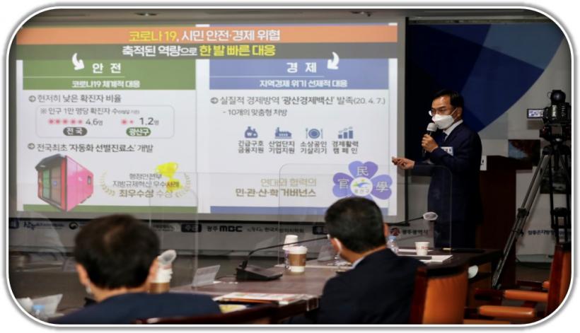 ±è ûÀåÀº ¹ßÇ¥¿¡¼ ¡®³» »îÀÌ ÇູÇÑ ±¤»ê¡¯À» ¸ñÇ¥·Î ¾ÈÀü°ú °æÁ¦¿¡ ¿ª·®À» ÁýÁßÇß°í, Áö³ 2³â°£ ±¸ÃàÇÑ ¾ÈÀü ÀÎÇÁ¶ó¸¦ Åä´ë·Î Äڷγª19¿¡ ü°èÀûÀ¸·Î ´ëÀÀÇß´Ù°í ÀüÇß´Ù. ƯÈ÷, ¡°±¤ÁÖ ¸éÀûÀÇ 45%, Àα¸ÀÇ 28%¸¦ Â÷ÁöÇϰí ÀÖ´Â ±¤»ê±¸¿¡¼ ±¤ÁÖ Àüü È®ÁøÀÚÀÇ 10% ¹Û¿¡ ³ª¿ÀÁö ¾Ê´Â °ÍÀº °ÅÀÇ ±âÀû¿¡ °¡±î¿î ¼º°ú´Ù¡±¶ó°í °Á¶Çß´Ù.