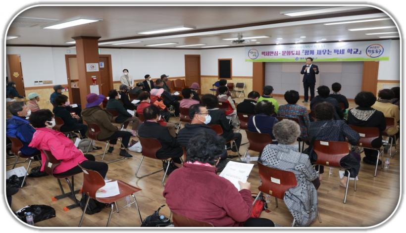 µ¿±¸´Â ¡®¹é¼¼ÀΠǰ°Ý °®Ã߱⡯ »ç¾÷ ÀÏȯÀ¸·Î Áö¿ª ¾î¸£½Å 200¿© ¸íÀ» ´ë»óÀ¸·Î ±Ç¿ªÀ» ¼øÈ¸Çϸç ÃÑ 4ȸ¿¡ °ÉÃÄ ¹é¼¼Çб³¸¦ ¿î¿µÇϰí ÀÖ´Ù. ÀÚ½ÅÀÌ »ì°í ÀÖ´Â ¸¶À»¿¡¼ Ä£±¸µé°ú ÇÔ²² Ȱ±âÂù ³ëÈĸ¦ º¸ÀåÇÏ´Â ±³À°À¸·Î ÁøÇà ÁßÀÌ´Ù.