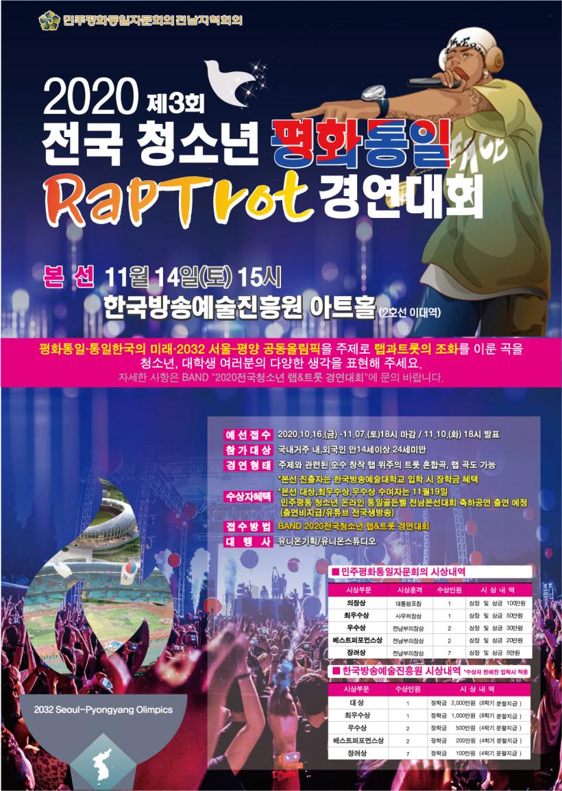 ¹ÎÁÖÆòÈÅëÀÏÀÚ¹®È¸ÀÇ Àü³²Áö¿ªÈ¸ÀÇ´Â ¡°³²ºÏ ÆòÈÅëÀϰú ÅëÀÏÇѱ¹ÀÇ ¹àÀº ¹Ì·¡, ƯÈ÷ ¿À´Â 2032³â ¼¿ï․Æò¾ç °øµ¿¿Ã¸²ÇÈ °³ÃÖ À¯Ä¡¸¦ ÁÖÁ¦·Î ÇÏ´Â ¡®2020³â Á¦3ȸ Àü±¹ û¼Ò³â ÆòÈÅëÀÏ RapTrot °æ¿¬´ëȸ¡¯¸¦ °³ÃÖÇÑ´Ù¡±°í ÃÖ±Ù ¹àÇû´Ù.