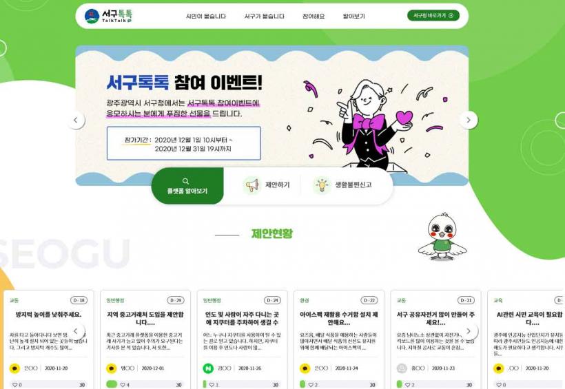 ÇöÀç Âü¿©À̺¥Æ®¸¦ ÁøÇàÁßÀ̸ç, ¿À´Â 12¿ù 31ÀϱîÁö ȨÆäÀÌÁö(https://www.seogu.gwangju.kr/seogutalktalk) ³»ÀÇ À̺¥Æ® °Ô½ÃÆÇÀ» ÅëÇØ ÁøÇàµÈ´Ù.