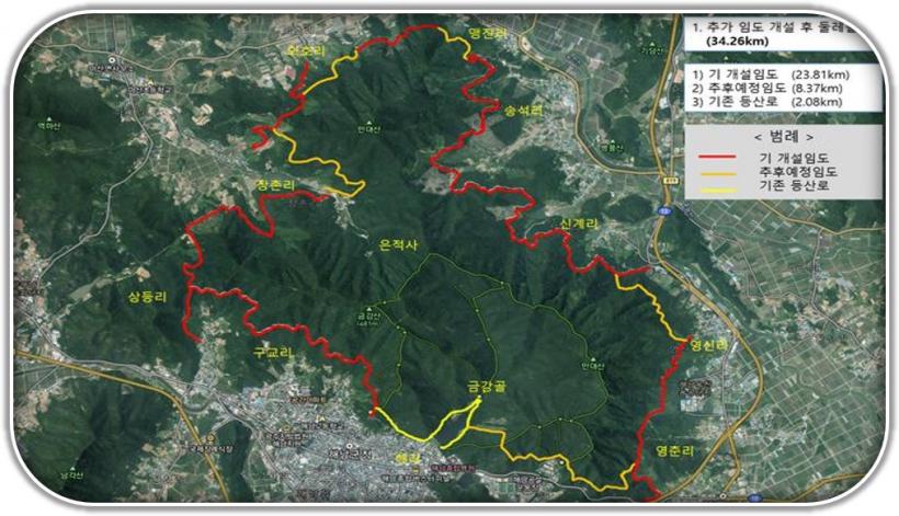ÇØ³²±ºÀº ±Ý°»ê ÀÏ´ë¿¡ ÃÑ¿¬Àå 34.26kmÀÇ µÑ·¹±æÀ» Á¶¼ºÇÑ´Ù. µÑ·¹±æÀº ±Ý°»ê, ¸¸´ë»ê ÀÏ´ë ±âÁ¸ÀÓµµ¿Í µî»ê·Î µî 25.89km¸¦ ¿¬°áÇϰí, ¹Ì°³¼³ ±¸°£¿¡´Â ½Å¼³ÀÓµµ 8.37km°¡ Á¶¼ºµÈ´Ù.