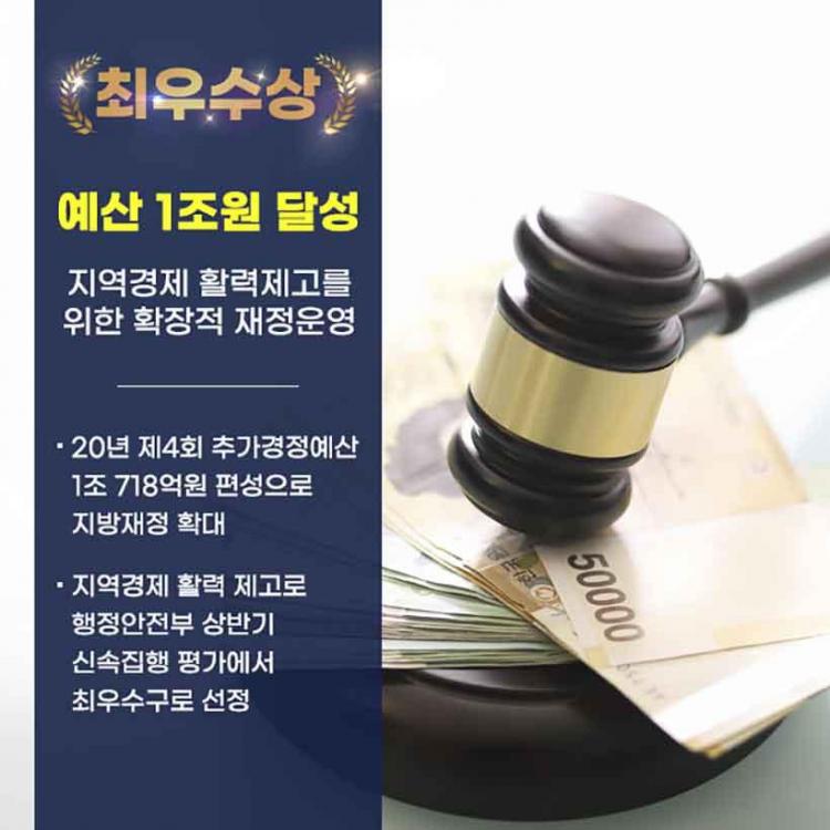 ¸ÕÀú ▴¿¹»ê 1Á¶¿ø ´Þ¼º, Áö¿ª°æÁ¦ Ȱ·ÂÁ¦°í¸¦ À§ÇÑ È®ÀåÀû ÀçÁ¤¿î¿µ¡¯ »ç·Ê´Â ±¹・½Ãºñ µî °¡¿ë Àç»ê È®º¸, ¿¹»ê ½Å¼ÓÁýÇà¿¡ µû¸¥ Áö¿ª°æÁ¦ Ȱ·Â Á¦°í ¹× »ó¹Ý±â ½Å¼ÓÁýÇà Æò°¡ ÃÖ¿ì¼ö±¸ ¼±Á¤, Á¦4ȸ Ãß°¡°æÁ¤¿¹»ê ±âÁØ ±¤Áֽà ÀÚÄ¡±¸ ÃÖÃÊ 1Á¶¿ø ±Ô¸ð ¿¹»ê Æí¼º µîÀÇ ¼º°ú¸¦ ÀÎÁ¤¹Þ¾Æ ÃÖ¿ì¼ö½ÃÃ¥À¸·Î ¼±Á¤µÆ´Ù.