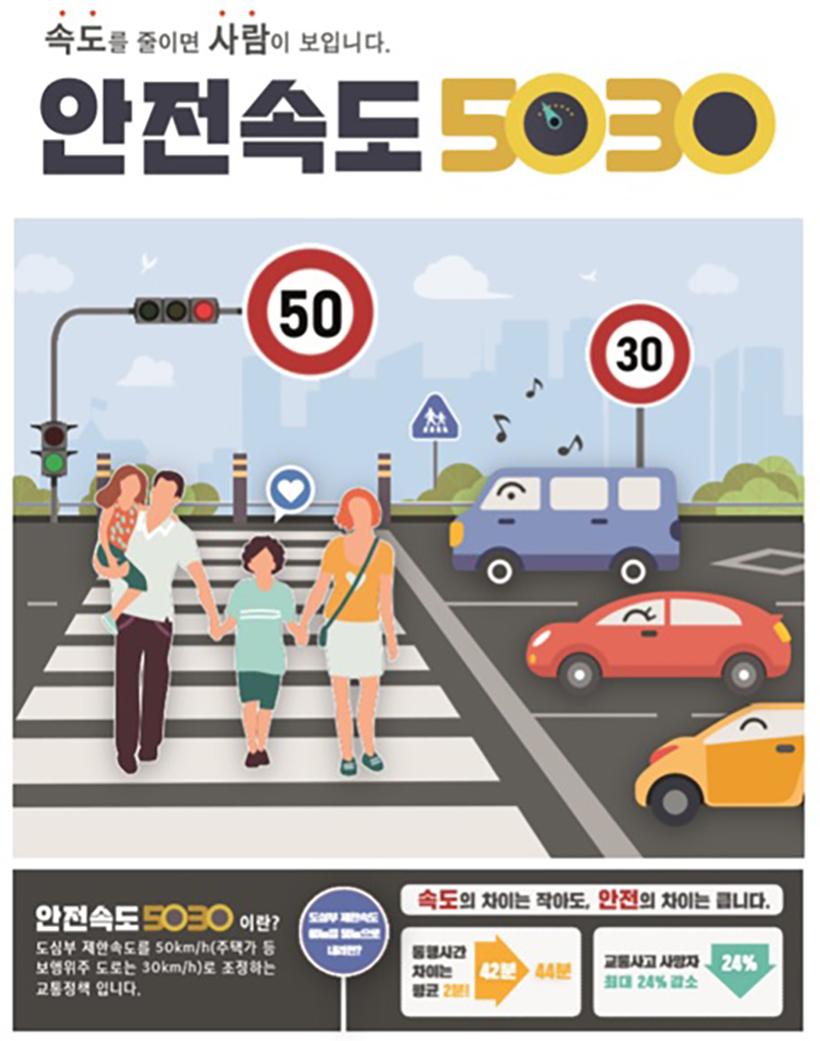 ¡®¾ÈÀü¼Óµµ 5030¡¯Àº µµ·Î À§ º¸ÇàÀÚÀÇ ¾ÈÀü°ú ±³Åë»ç°í ¹ß»ý ½Ã »ç¸ÁÀÚ¸¦ ÁÙÀ̱â À§ÇØ ÀϹݵµ·Î´Â 50§°/h(ÇÊ¿ä½Ã 60§°/h), ÁÖÅð¡ µî À̸鵵·Î´Â 30§°/h ÀÌÇÏ·Î µµ½ÃºÎµµ·ÎÀÇ Á¦ÇѼӵµ¸¦ ¿ëµµ¿Í »óȲ¿¡ µû¶ó Á¶Á¤ÇÏ´Â ¹üÁ¤ºÎ ¾ÈÀüÁ¤Ã¥ÀÌ´Ù.