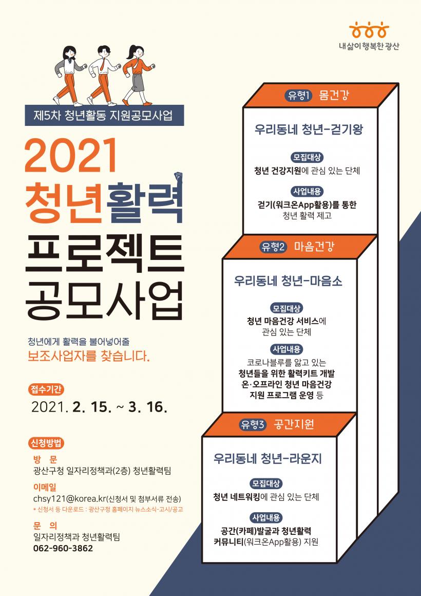 [°ø°£´º½º = ±è´ë¿µ±âÀÚ] ±¤ÁÖ±¤¿ª½Ã ±¤»ê±¸(±¸Ã»Àå ±è»ïÈ£)°¡, Ȱ·Â ³ÑÄ¡°í ÇູÇÑ »îÀÇ ÁÖü·Î û³âÀÌ °Åµì³¯ ¼ö ÀÖµµ·Ï Áö¿øÇÏ´Â, ¡®2021 û³âȰ·ÂÇÁ·ÎÁ§Æ® °ø¸ð»ç¾÷¡¯ Âü¿© û³â´Üü¸¦ ¿À´Â 3¿ù 16ÀϱîÁö ¸ðÁýÇÑ´Ù.
