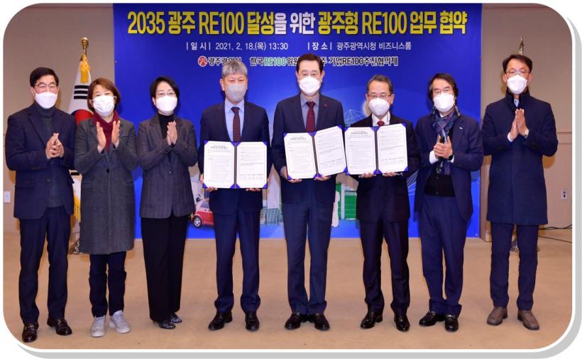 ±¤ÁÖ±¤¿ª½Ã´Â 18ÀÏ ¿ÀÈÄ ½Ãû ºñÁî´Ï½º·ë¿¡¼ Çѱ¹RE100À§¿øÈ¸, ±¤ÁÖ±â¾÷RE100ÃßÁøÇùÀÇü¿Í ¡®±¤ÁÖÇü RE100 ¾÷¹«Çù¾à¡¯À» ü°áÇß´Ù. Çù¾à½Ä¿¡´Â À̿뼷 ±¤ÁÖ½ÃÀå, ±è±¤¶õ ±¤ÁÖ½ÃÀÇȸ ±×¸°´ºµôƯº°À§¿øÈ¸ À§¿øÀå, Áø¿ì»ï Çѱ¹ RE100À§¿øÈ¸ À§¿øÀå, ±èÇü¼ø ±¤ÁÖ±â¾÷RE100ÃßÁøÇùÀÇü ´ëÇ¥, À̸íÁÖ ¸íÁö´ëÇб³ ±³¼ö µîÀÌ Âü¼®Çß´Ù.
