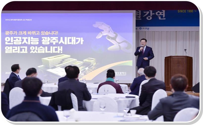 | À̿뼷 ±¤ÁÖ±¤¿ª½ÃÀåÀÌ 19ÀÏ ¿ÀÀü ºÏ±¸ ±¤ÁÖ°úÇбâ¼úÁøÈï¿ø¿¡¼ ¿¸° ±¤Áְ濵ÀÚÃÑÇùȸ ±Ý¿äÁ¶ÂùÆ÷·³¿¡ Âü¼®ÇØ '2021 ±¤ÁÖ½ÃÁ¤ ¿î¿µ ¹æÇâ'À» ÁÖÁ¦·Î °¿¬À» ÇÑ µÚ ±â³äÃÔ¿µÀ» Çϰí ÀÖ´Ù. |