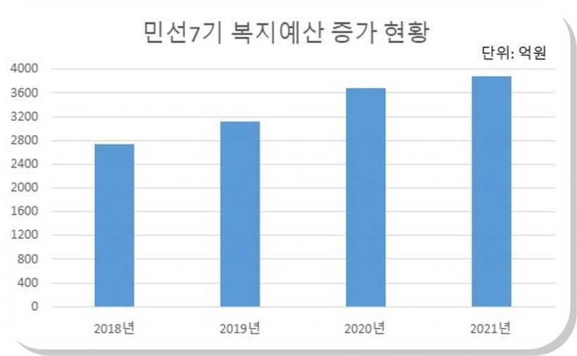 ¹Î¼±7±â 3³â°£ ¼øÃµ½Ã º¹Áö °ü·Ã ¿¹»êÀÌ º»¿¹»ê ±âÁØ Áö³ 2018³â 2,739¾ï ¿ø¿¡¼ 2021³â 3,875¾ï¿øÀ¸·Î 42%°¡ Áõ°¡Çß°í ´Ã¾î³ º¹Áö¿¹»ê ¸¸Å ½Ã¹ÎÀÌ Ã¼°¨ÇÏ°í »î¿¡ ÈûÀÌ µÇ´Â º¹Áö¸¦ À§ÇÑ ÀÎÇÁ¶ó¸¦ È®ÃæÇϰí, ¿µÀ¯¾ÆºÎÅÍ ¾î¸£½Å±îÁö ¸ðµÎ°¡ ´©¸®´Â Æ÷¿ëº¹Áö Á¤Ã¥À» ÆîÄ¡¸ç ¹Î¼±7±â ´õ µû¶æÇÑ º¹Áöµµ½Ã ¼øÃµÀ» ½ÇÇöÇÏ´Â Ãʼ®À» ´ÙÁ³´Ù.