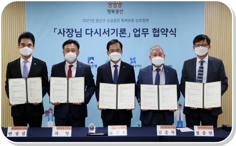 ±è»ïÈ£ ±¤»ê±¸Ã»Àå, ÃÖ¿µ ±¤ÁÖÀºÇà ºÎÇàÀå, ±èÁ¾º¹ ±¤ÁÖ¾î·æ½ÅÇùÀÌ»çÀå, º¯Á¤¼· ±¤Áֽſ뺸ÁõÀç´Ü ÀÌ»çÀå, Á¤Á¾Çö ±¤»ê±¸±â¾÷ÁÖÄ¡ÀǼ¾ÅÍÀåÀº 15ÀÏ ¿ÀÈÄ 2½Ã ±¸Ã» ¼ÒȸÀǽǿ¡¼ ¼Ò»ó°øÀΠƯ·Êº¸Áõ ¡®»çÀå´Ô ´Ù½Ã¼±â·Ð¡¯ Çù¾àÀ» ¸Î¾ú´Ù.